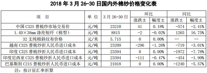 國內(nèi)棉價弱勢平穩(wěn)。據(jù)國家統(tǒng)計局數(shù)據(jù)顯示,2018年3月中國制造業(yè)采購經(jīng)理指數(shù)(PMI)51.5%,比上月上升1.2個百分點,制造業(yè)呈現(xiàn)穩(wěn)中有升的發(fā)展態(tài)勢,近日國務院減稅政策宣布,將進一步激發(fā)包括在棉紡織行業(yè)在內(nèi)的制造業(yè)活力。棉市方面,本周儲備棉輪出成交均價14193元/噸,較上周下跌186元/噸,較同等級新棉有200-300元/噸價格優(yōu)勢,部分企業(yè)反映部分新棉品質(zhì)在馬值和含雜等方面不及儲備新疆棉,環(huán)保整治和禁止廢棉進口政策導致精梳落棉供應減少,使得儲備地產(chǎn)棉競爭優(yōu)勢進一步凸顯,紡企更愿意購買儲備棉。近期新疆部分企業(yè)開始大規(guī)模向內(nèi)地庫開始移貨,棉花供應量充足,紡織原料價格走弱,并向下游傳導,純棉紗價格逐漸止?jié)q企穩(wěn),棉紗銷勢維持分化,但庫存有所下降,下游染料價格上調(diào),導致坯布訂單出現(xiàn)排隊現(xiàn)象,短期內(nèi)下游支撐尚未形成明顯支撐,國內(nèi)棉價或?qū)⒕S持弱勢平穩(wěn)運行。