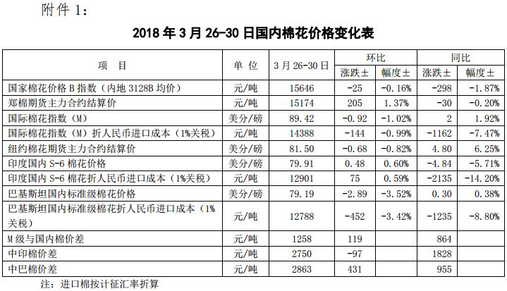 附件1:2018年3月26-30日國內(nèi)外棉花價格變化表