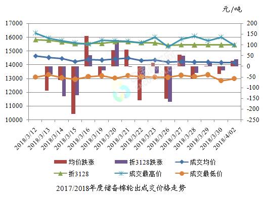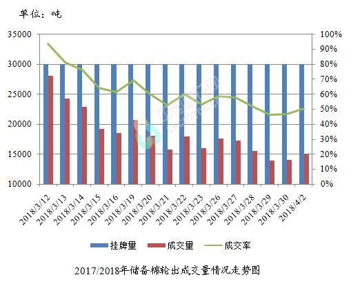 4月2日儲(chǔ)備棉輪出銷售資源30000.315噸,實(shí)際成交15055.192噸,成交率50.18%。平均成交價(jià)格14179元/噸(較前一日上漲26元/噸);折3128價(jià)格15464元/噸(較前一日上漲32元/噸)?!?/p>