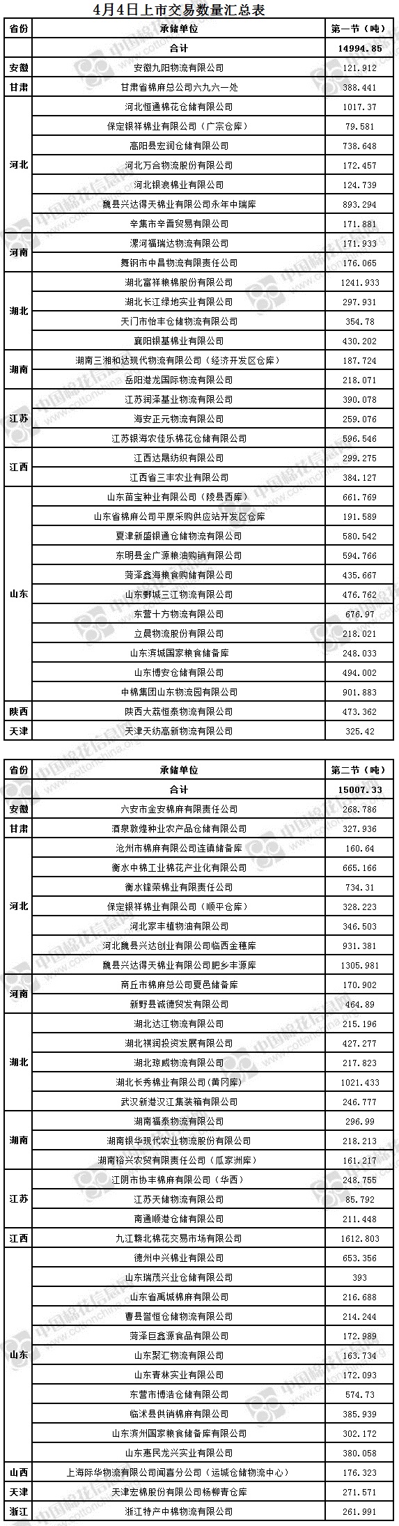 4月4日兩節(jié)共計輪出儲備棉30002.18噸。第一節(jié)銷售儲備棉14994.85噸,其中需要倒垛出庫65捆。第二節(jié)銷售儲備棉15007.33噸,其中需要倒垛出庫91捆。