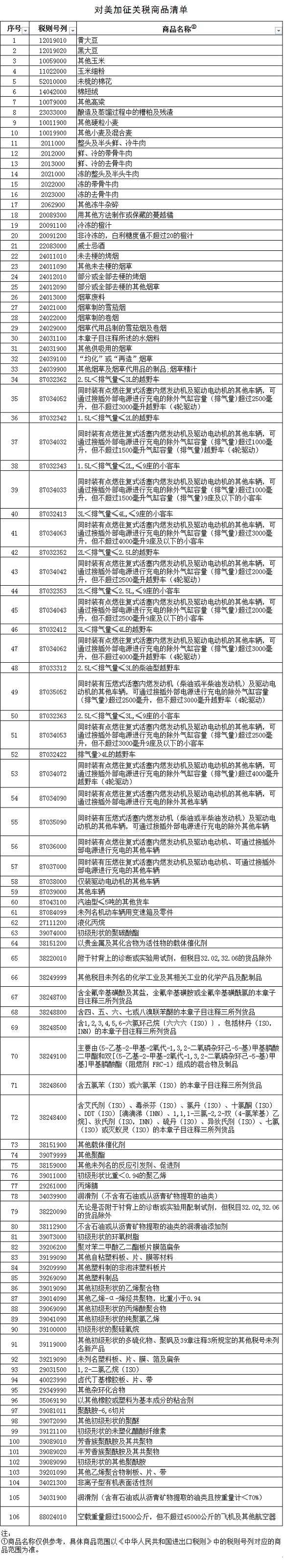 一、加征關(guān)稅的商品為大豆、汽車、化工品等14類106項(xiàng)商品。征稅范圍詳見附表。