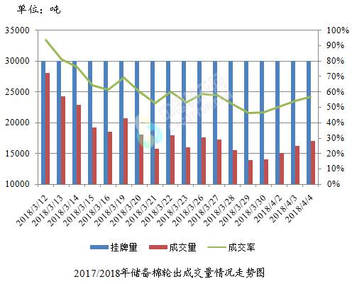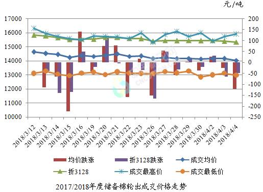 4月4日儲備棉輪出銷售資源30002.18噸,實際成交16997.928噸,成交率56.66%。平均成交價格14035元/噸(較前一日下跌120元/噸);折3128價格15349元/噸(較前一日下跌49元/噸)。