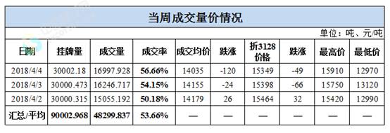 累計情況:截至4月4日,累計計劃出庫54.01萬噸,累計出庫成交32.81萬噸,成交率為60.74%;成交最高價16310元/噸,最低價12850元/噸。