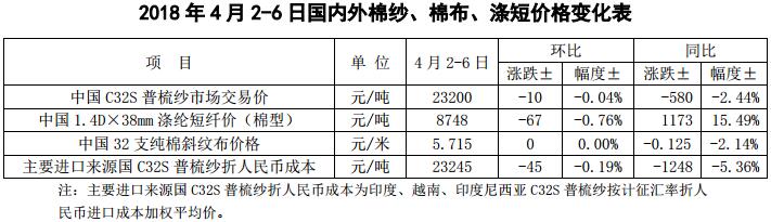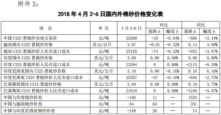 附件2:2018年4月2-6日國內(nèi)外棉紗價(jià)格變化表