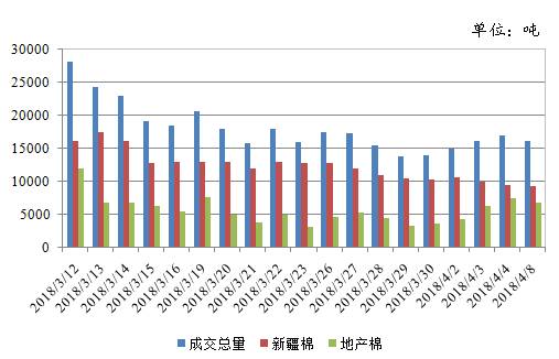 上周(2018年4月2-8日),2017/2018年度儲備棉輪出第四周,中國儲備棉管理有限公司上市交易儲備棉重量12萬噸,其中新疆棉3.95萬噸,占比33%,地產(chǎn)棉8.05萬噸,占比67%;實際成交6.44萬噸,成交率54%,新疆棉成交3.95萬噸,成交率100%,地產(chǎn)棉成交2.49萬噸,成交率31%。