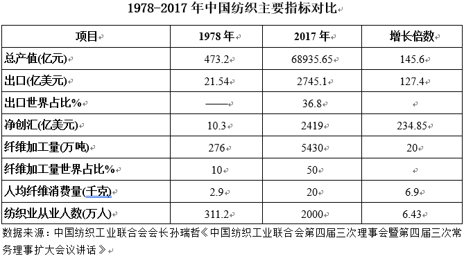 1978年-2017年中國紡織工業(yè)總產(chǎn)值從473.2億元猛增到68935.65億元,增長145.6倍;出口從21.54億美元增到2745.1億美元,增長127.4倍,紡織品出口占世界紡織貿(mào)易的36.8%;凈創(chuàng)匯從10.3億美元增長到2419億美元。(編輯:DYL)