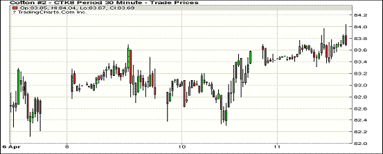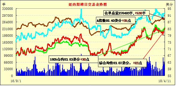 11日紐約期棉1805合約結(jié)算價83.83美分,漲30點;1807合約結(jié)算價83.41美分,漲24點;1812合約結(jié)算價78.63美分,漲25點;1903合約結(jié)算價78.74美分,漲26點。1807合約連續(xù)五個交易日收漲,累計漲幅369點。當(dāng)日7月合約小幅高開,開盤后缺乏有利支撐短暫下行,后在83-83.3美分區(qū)間窄幅震蕩波動,買盤低點發(fā)力,市場受支撐上行逼近83.6美分,高點處賣盤入場市場被打壓回落,最終小幅收漲。外圍美元指數(shù)下跌,小麥期貨下跌,玉米和大豆期貨上漲。