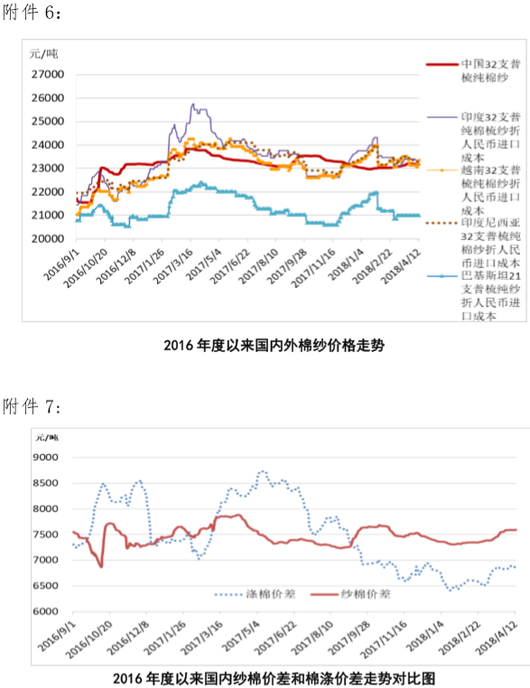 附件6:2016年度以來國(guó)內(nèi)外棉紗價(jià)格走勢(shì)圖