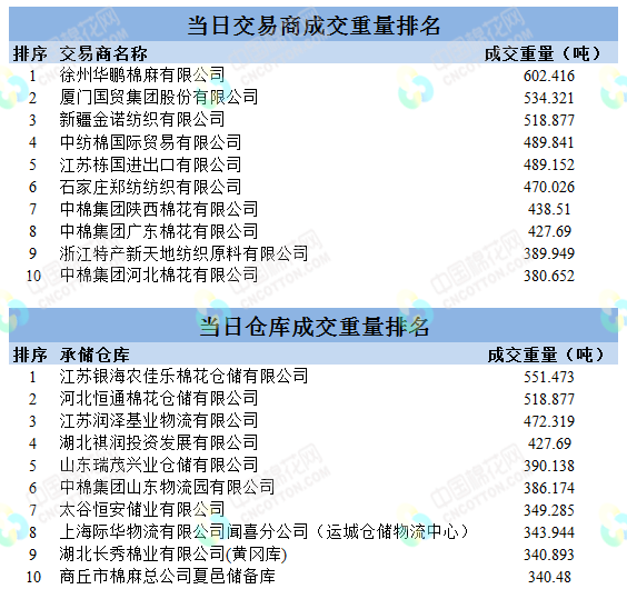 地產(chǎn)棉成交4507.987噸,成交率20%,成交均價13853元/噸,平均加價137元/噸,最高成交價15090元/噸,最低成交價13040元/噸;新疆棉成交7098.207噸,成交率100%,成交均價14686元/噸,平均加價888元/噸,最高成交價15590元/噸,最低成交價13860元/噸。