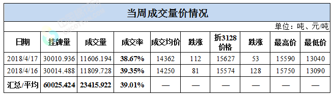 累計(jì)情況:截至4月17日,累計(jì)計(jì)劃出庫78萬噸,累計(jì)出庫成交43.5萬噸,成交率為56%;成交最高價16310元/噸,最低價12700元/噸。
