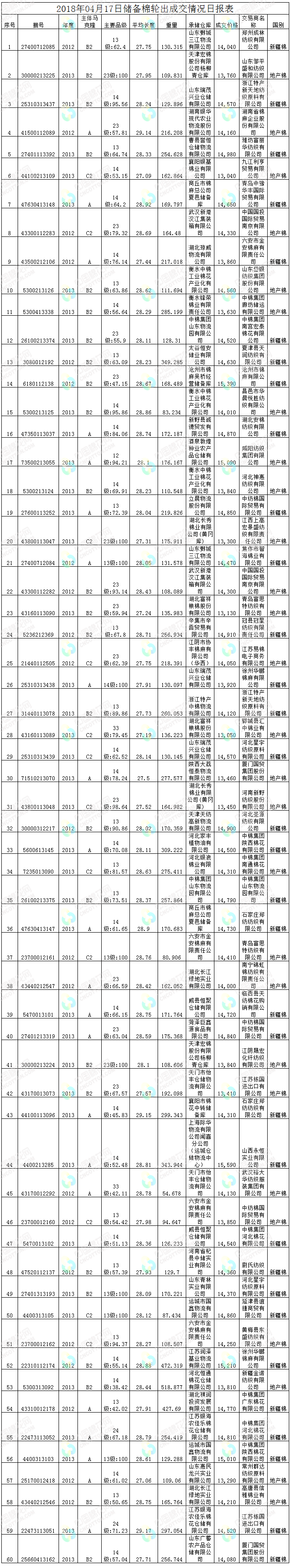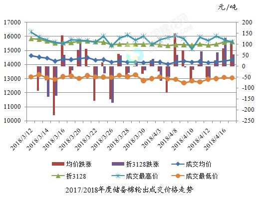 4月17日儲備棉輪出銷售資源30010.936噸,實(shí)際成交11606.194噸,成交率38.67%。平均成交價格14362元/噸(較前一日上漲112元/噸);折3128價格15627元/噸(較前一日上漲53元/噸)。