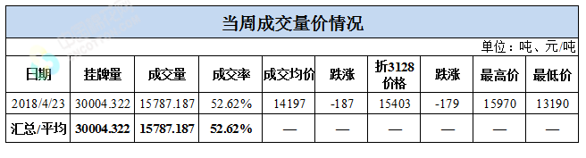 累計情況:截至4月23日,累計計劃出庫90萬噸,累計出庫成交48.4萬噸,成交率為54%;成交最高價16310元/噸,最低價12700元/噸。