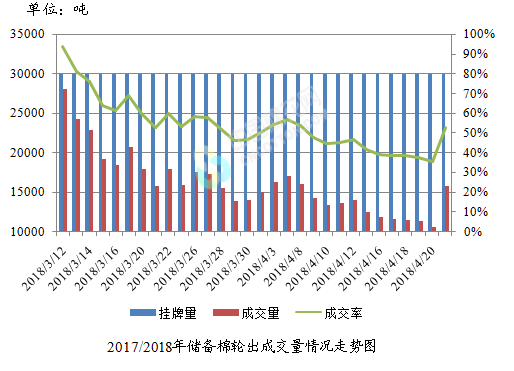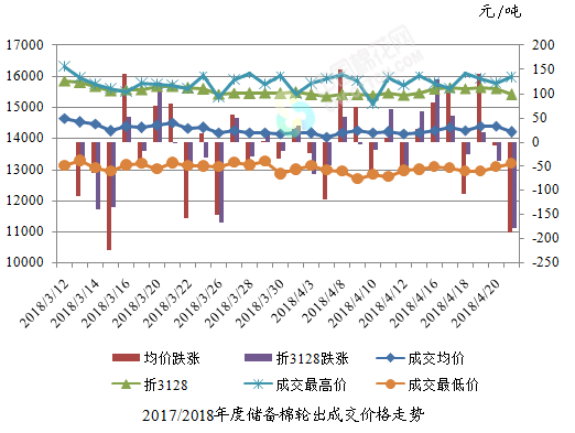 4月23日儲備棉輪出銷售資源30004.322噸,實際成交15787.187噸,成交率52.62%。平均成交價格14197元/噸(較前一日下降187元/噸);折3128價格15403元/噸(較前一日下降179元/噸)。