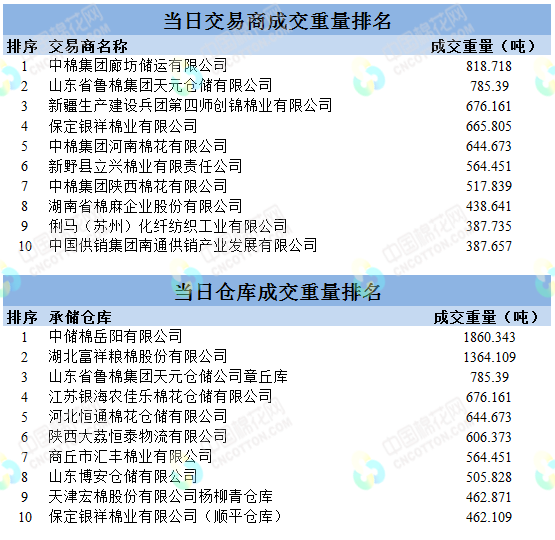 地產(chǎn)棉成交8800.378噸,成交率38%,成交均價13804元/噸,平均加價102元/噸,最高成交價14590元/噸,最低成交價13190元/噸;新疆棉成交6986.809噸,成交率100%,成交均價14692元/噸,平均加價1011元/噸,最高成交價15970元/噸,最低成交價13860元/噸。