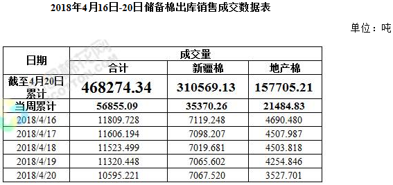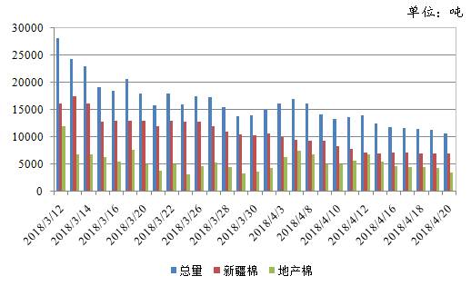 上周(2018年4月16-20日),2017/2018年度儲備棉輪出第六周,中國儲備棉管理有限公司上市交易儲備棉重量15萬噸,其中新疆棉3.5萬噸,占比24%,地產棉11.5萬噸,占比76%;實際成交5.7萬噸,成交率38%,新疆棉成交3.5萬噸,成交率100%,地產棉成交2.2萬噸,成交率19%。