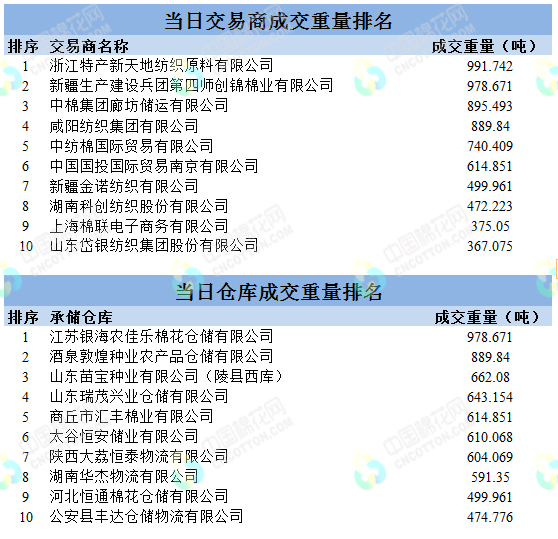 地產(chǎn)棉成交7595.665噸,成交率33%,成交均價14064元/噸,平均加價192元/噸,最高成交價15210元/噸,最低成交價12990元/噸;新疆棉成交7180.98噸,成交率100%,成交均價14573元/噸,平均加價961元/噸,最高成交價15970元/噸,最低成交價13730元/噸。