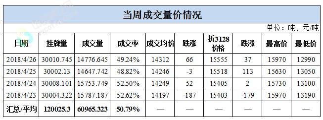 累計情況:截至4月26日,累計計劃出庫99萬噸,累計出庫成交52.92萬噸,成交率為53.44%;成交最高價16310元/噸,最低價12700元/噸。