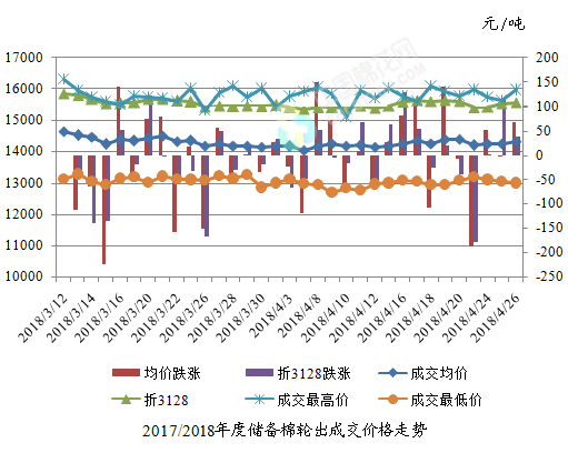 4月26日儲備棉輪出銷售資源30010.745噸,實際成交14776.645噸,成交率49.24%。平均成交價格14312元/噸(較前一日上漲66元/噸);折3128價格15555元/噸(較前一日上漲37元/噸)。