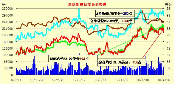 26日紐約期棉市場(chǎng)1807合約結(jié)算價(jià)84.17美分,漲23點(diǎn);1812合約結(jié)算價(jià)78.96美分,跌3點(diǎn);1903合約結(jié)算價(jià)78.71美分,跌23點(diǎn)。當(dāng)日7月合約小幅低開(kāi),開(kāi)盤(pán)后在83.50-84.00美分區(qū)間內(nèi)小幅震蕩運(yùn)行,后買(mǎi)盤(pán)發(fā)力,交易重心小幅走高,美棉出口周報(bào)發(fā)布后走勢(shì)良好,符合市場(chǎng)樂(lè)觀預(yù)期,市場(chǎng)受支撐上行至當(dāng)日高點(diǎn)84.97美分處,后有所回落,最終小幅上漲收盤(pán)。據(jù)美國(guó)農(nóng)業(yè)部(USDA),4.12-4.19日一周美國(guó)凈簽約出口2017/18年度陸地棉70760噸(含新簽約72733噸,另取消1973噸前期訂單),較前一周增加8%,較近4周平均簽約量增加9%;裝運(yùn)2017/18年度陸地棉95572噸,較前一周增加16%,但較近4周平均減少4%。外圍美元指數(shù)上漲,玉米、大豆和小麥期貨下跌。