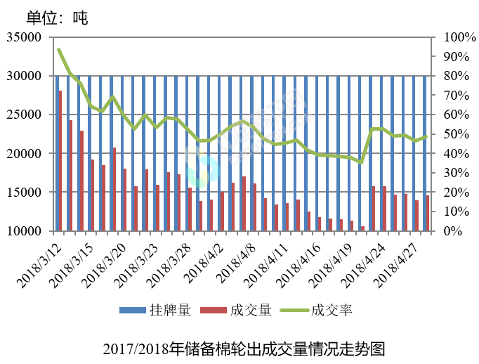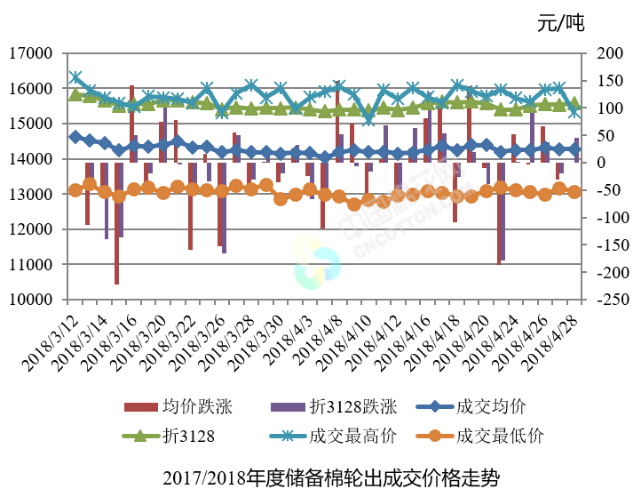 4月28日儲備棉輪出銷售資源30009.34噸,實(shí)際成交14581.571噸,成交率48.59%。平均成交價格14275元/噸(較前一日下跌6元/噸);折3128價格15581元/噸(較前一日上漲45元/噸)。