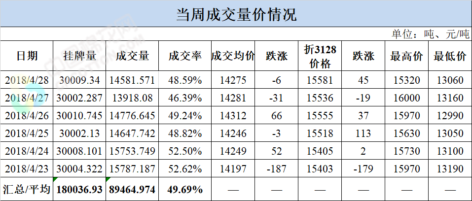 累計情況:截至4月28日,累計計劃出庫108萬噸,累計出庫成交55.82萬噸,成交率為53%;成交最高價16310元/噸,最低價12700元/噸。