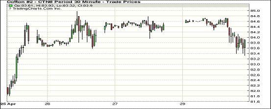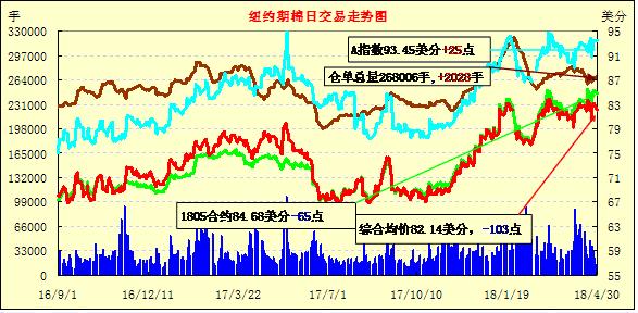 30日紐約期棉市場(chǎng)整體收跌。1807合約結(jié)算價(jià)83.84美分,跌67點(diǎn);1812合約結(jié)算價(jià)78.78美分,跌49點(diǎn);1903合約結(jié)算價(jià)78.61美分,跌39點(diǎn)。當(dāng)日7月合約穩(wěn)定開盤,開盤后圍繞84.6美分一線震蕩運(yùn)行,后高點(diǎn)處賣盤入場(chǎng),市場(chǎng)承壓走低,盤中試圖穩(wěn)定在84美分以上失敗,因上漲動(dòng)力不足,以跌勢(shì)收盤。因多國(guó)處于勞動(dòng)節(jié)假期,當(dāng)日交易量雖較前一日增加,但仍處于低位。外圍美元指數(shù)上漲,玉米和小麥期貨上漲,大豆期貨下跌。