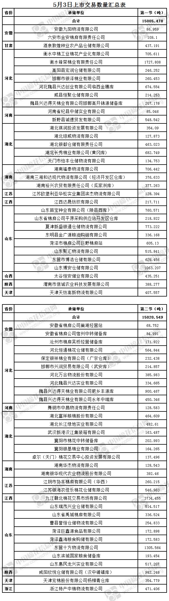 5月3日兩節(jié)共計輪出儲備棉30026.027噸。第一節(jié)銷售儲備棉15005.478噸,其中需要倒垛出庫81捆。第二節(jié)銷售儲備棉15020.549噸,其中需要倒垛出庫85捆。