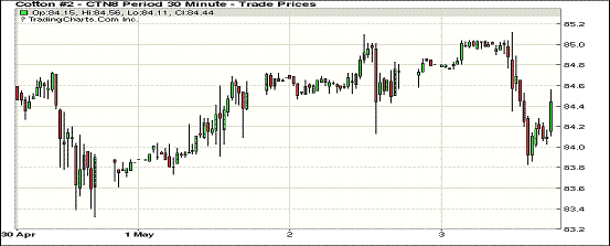 3日紐約期棉市場近跌遠漲。1807合約結(jié)算價84.50美分,跌18點;1812合約結(jié)算價79.59美分,漲16點;1903合約結(jié)算價79.09美分,漲13點。當(dāng)日7月合約穩(wěn)定開盤,開盤后受買盤支撐交易重心上行突破85美分一線,后圍繞85美分窄幅波動,美棉出口周報發(fā)布后,由于本年度陸地棉簽約量處于市場預(yù)期低位,市場小幅走低,但在買盤有力支撐下迅速回彈,至當(dāng)日高點85.12美分處賣盤入場,交易重心承壓走低,下行擊穿84美分,因上漲動力不足,最終小幅收跌。據(jù)美國農(nóng)業(yè)部(USDA),4.19-4.26日一周美國凈簽約出口2017/18年度陸地棉43046噸(含新簽約54613噸,另取消11567噸前期訂單),較前一周減少39%,較近4周平均簽約量減少34%;裝運2017/18年度陸地棉98112噸,較前一周增加3%,較近4周平均持平。外圍美元指數(shù)下跌,大豆期貨下跌,玉米和小麥期貨上漲。