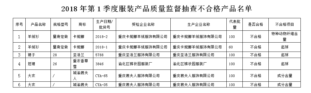 附:2018年第1季度服裝產(chǎn)品質(zhì)量監(jiān)督抽查不合格產(chǎn)品名單