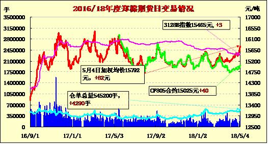 | CF805 | 15035 | 15070 | 14995 | 15030 | 15025 | 40 | 10358 | -1678 | 14001816 | 48800 | -6796 |