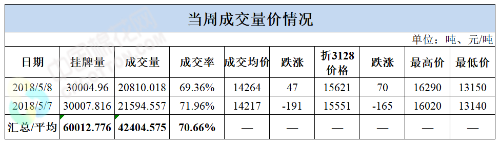 累計(jì)情況:截至5月8日,累計(jì)計(jì)劃出庫(kù)120萬(wàn)噸,累計(jì)出庫(kù)成交64萬(wàn)噸,成交率為53%;成交最高價(jià)16310元/噸,最低價(jià)12700元/噸。