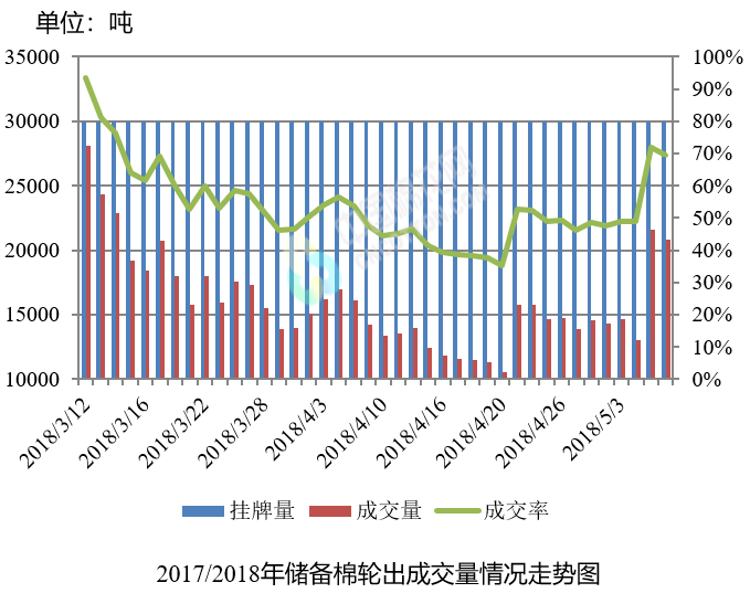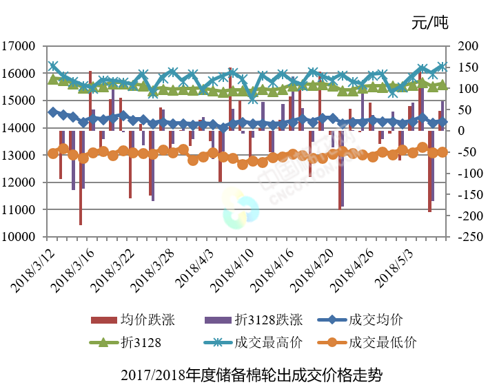 5月8日儲(chǔ)備棉輪出銷(xiāo)售資源30004.96噸,實(shí)際成交20810.018噸,成交率69.36%。平均成交價(jià)格14264元/噸(較前一日上漲47元/噸);折3128價(jià)格15621元/噸(較前一日上漲70元/噸)。