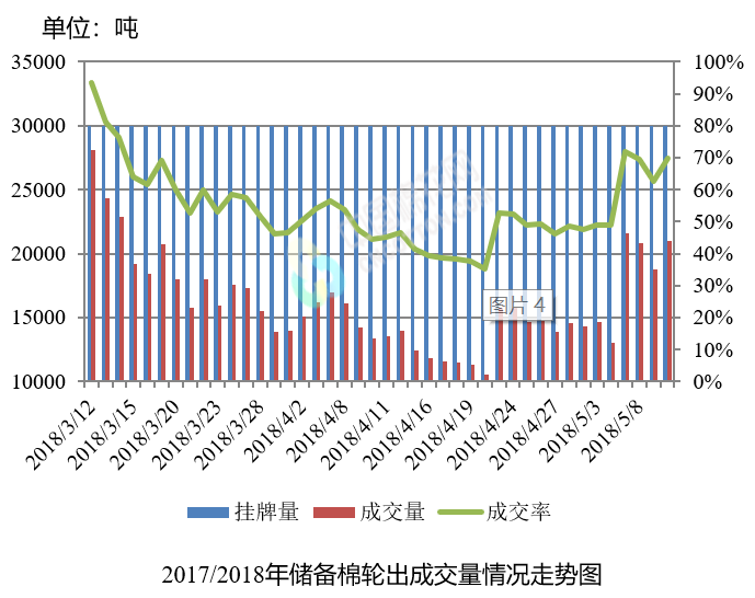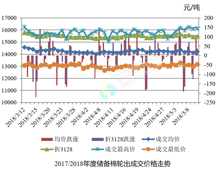 5月10日儲(chǔ)備棉輪出銷售資源30002.409噸,實(shí)際成交21005.652噸,成交率70.01%。平均成交價(jià)格14266元/噸(較前一日上漲101元/噸);折3128價(jià)格15531元/噸(較前一日上漲37元/噸)。