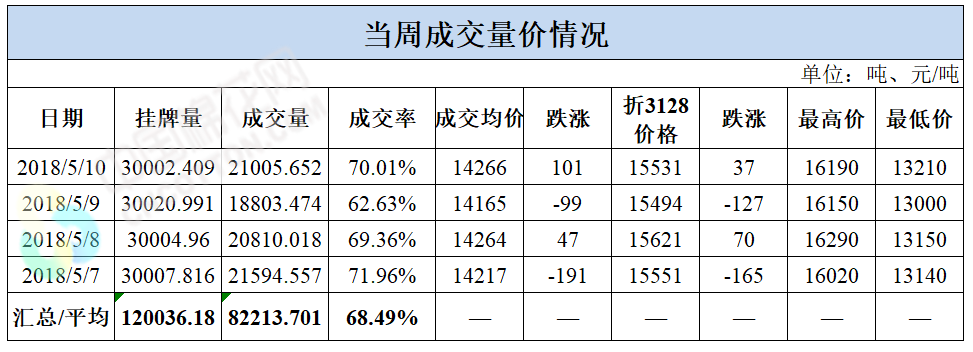 累計(jì)情況:截至5月10日,累計(jì)計(jì)劃出庫(kù)126萬(wàn)噸,累計(jì)出庫(kù)成交68萬(wàn)噸,成交率為54%;成交最高價(jià)16310元/噸,最低價(jià)12700元/噸。