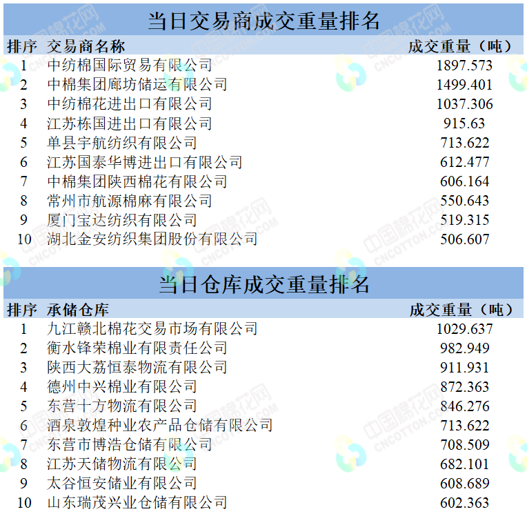 地產(chǎn)棉成交13996噸,成交率61%,成交均價(jià)13983元/噸,平均加價(jià)310元/噸,最高成交價(jià)15780元/噸,最低成交價(jià)13210元/噸;新疆棉成交7010噸,成交率100%,成交均價(jià)14832元/噸,平均加價(jià)1149元/噸,最高成交價(jià)16190元/噸,最低成交價(jià)14120元/噸。