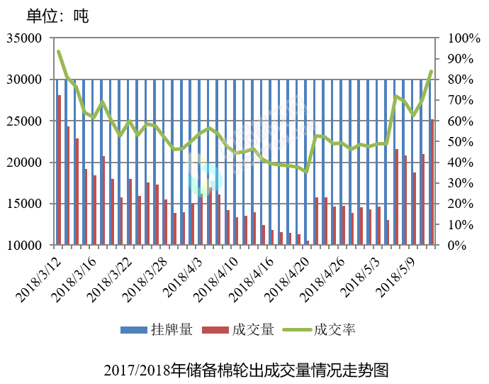 5月11日儲備棉輪出銷售資源30003.196噸,實際成交25162.484噸,成交率83.87%。平均成交價格14359元/噸(較前一日上漲93元/噸);折3128價格15543元/噸(較前一日上漲12元/噸)。