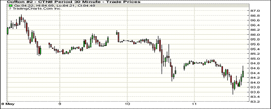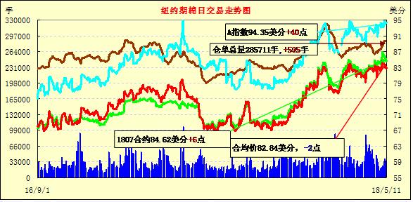11日紐約期棉市場近漲遠跌。1807合約結算價84.62美分,漲6點;1812合約結算價80.24美分,漲13點;1903合約結算價80.06美分,漲18點。7月合約穩(wěn)定開盤,開盤后在84.50-85美分區(qū)間震蕩運行,后賣盤入場,市場承壓走低,至當日低點83.50美分處買盤發(fā)力,交易重心上行,最終小幅收漲。據(jù)CFTC,截至5月4日ICE期棉未點價合約量累計163680張,較前一周增加3612張。其中,1807合約55085張,減469張;1812合約38546張,增加1129張。大量未點價合約對期棉行情形成支撐。外圍美元指數(shù)下跌,大豆、小麥和玉米期貨下跌。