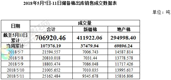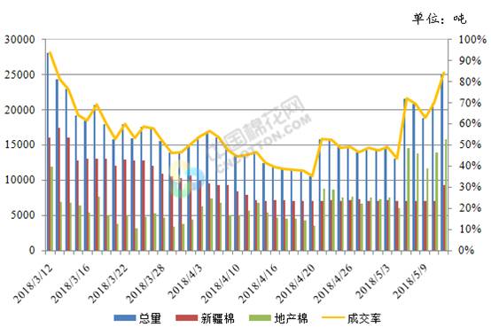 上周(2018年5月7-11日),2017/2018年度儲(chǔ)備棉輪出第九周,中國(guó)儲(chǔ)備棉管理有限公司上市交易儲(chǔ)備棉重量15萬(wàn)噸,其中新疆棉3.7萬(wàn)噸,占比25%,地產(chǎn)棉11.3萬(wàn)噸,占比75%;實(shí)際成交10.7萬(wàn)噸,成交率72%,新疆棉成交3.7萬(wàn)噸,成交率100%,地產(chǎn)棉成交7.0萬(wàn)噸,成交率62%。