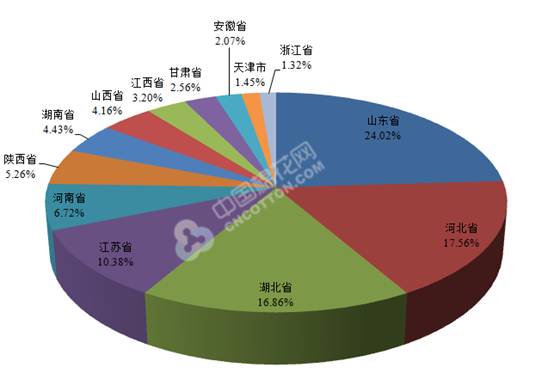 2017/2018年度儲(chǔ)備棉出庫(kù)銷售截至5月11日主要省份累計(jì)成交情況圖