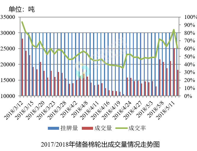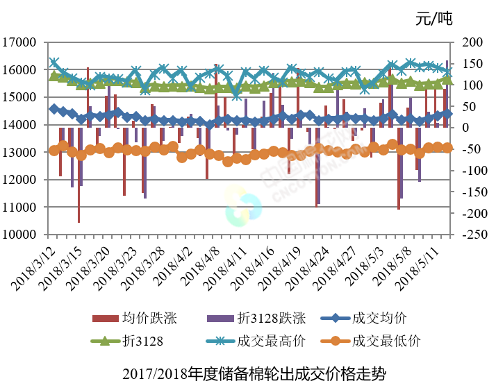 5月14日儲備棉輪出銷售資源30003.803噸,實際成交18223.989噸,成交率60.74%。平均成交價格14450元/噸(較前一日上漲91元/噸);折3128價格15701元/噸(較前一日上漲158元/噸)。