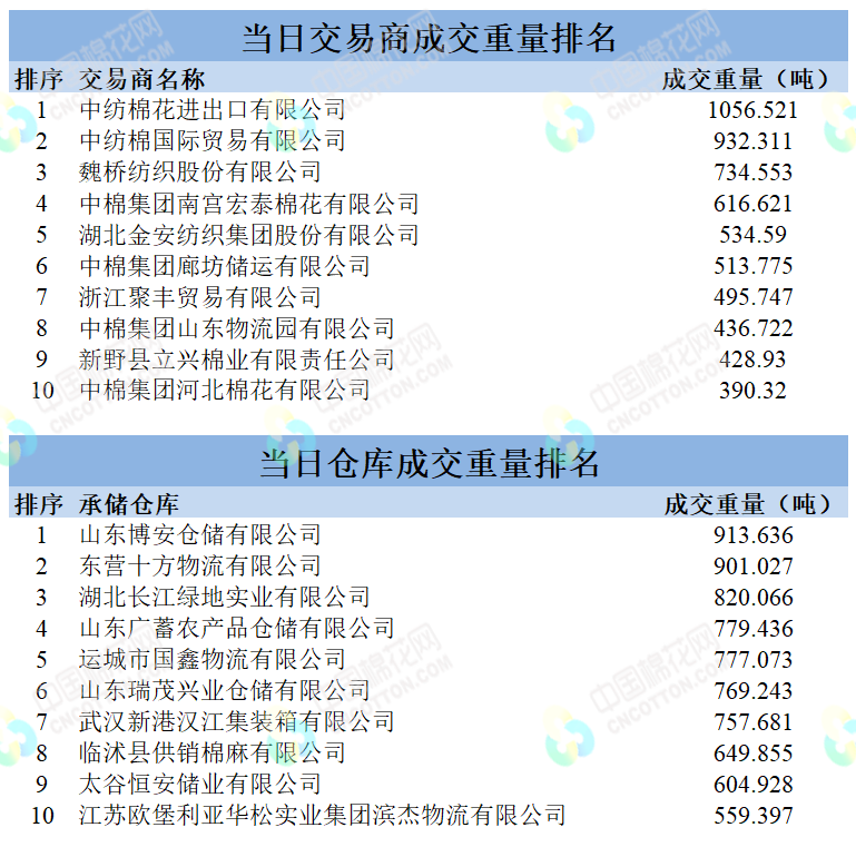 地產(chǎn)棉成交7903.332噸,成交率40%,成交均價13997元/噸,平均加價272元/噸,最高成交價15080元/噸,最低成交價13210元/噸;新疆棉成交10320.657噸,成交率100%,成交均價14796元/噸,平均加價1004元/噸,最高成交價15970元/噸,最低成交價14060元/噸。