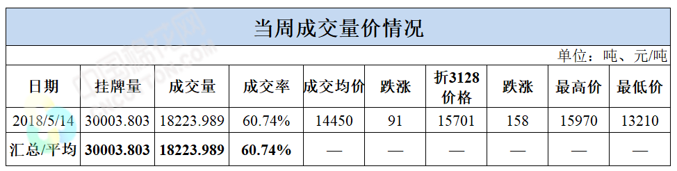 累計情況:截至5月14日,累計計劃出庫132萬噸,累計出庫成交72.5萬噸,成交率為55%;成交最高價16310元/噸,最低價12700元/噸。
