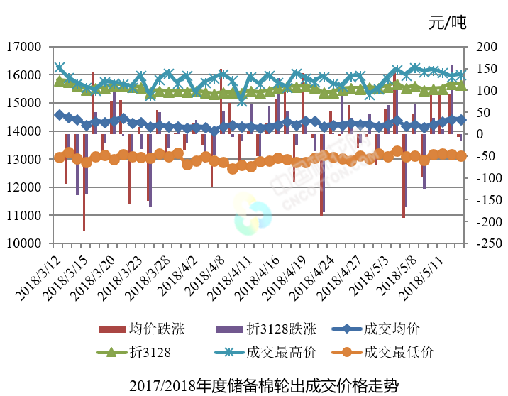 5月15日儲(chǔ)備棉輪出銷售資源30000.795噸,實(shí)際成交18790.78噸,成交率62.63%。平均成交價(jià)格14443元/噸(較前一日下跌7元/噸);折3128價(jià)格15686元/噸(較前一日下跌15元/噸)。