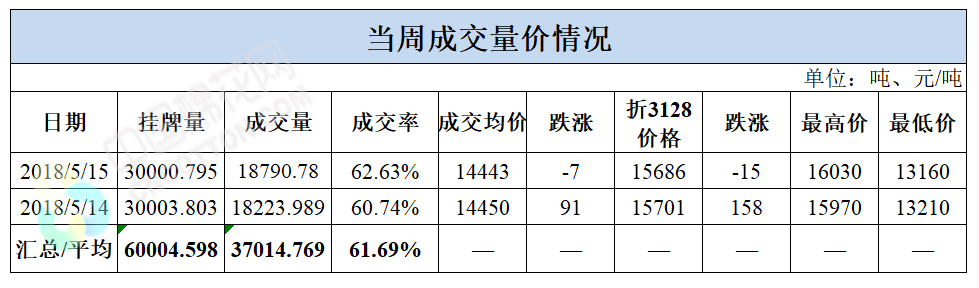 累計(jì)情況:截至5月15日,累計(jì)計(jì)劃出庫(kù)135萬(wàn)噸,累計(jì)出庫(kù)成交74.4萬(wàn)噸,成交率為55%;成交最高價(jià)16310元/噸,最低價(jià)12700元/噸。