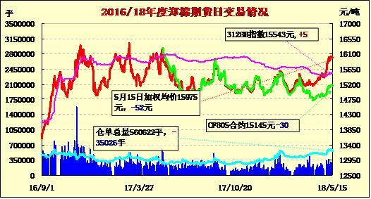 | CF805 | 15140 | 15180 | 15065 | 15115 | 15145 | -30 | 3874 | -220 | 14042482 | 0 | -27080 |