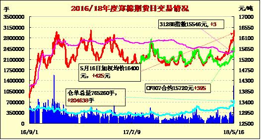 16日隔夜鄭棉橫向震蕩,今日早盤在多頭集中買盤推動下大幅上漲,午后封于漲停,日線形長陽線。日內(nèi)成交量成倍放大,持倉量大幅增加?;久媲闆r:商家新疆機采長度28強力27中紡庫報價在15800元/噸公定自提左右,實單有一定商談空間。新疆機采北疆庫長度28/29強度28/29左右報價在15700元/噸毛重。南疆手摘長度27/28強度25左右新疆自提報價在15500元/噸毛重。儲備地產(chǎn)棉轉(zhuǎn)售報價主流在13800-14500元/噸左右。長絨棉市場價格重心小幅走低,走貨一般,137級到廠價格在24800元/噸,237級在24200元/噸。