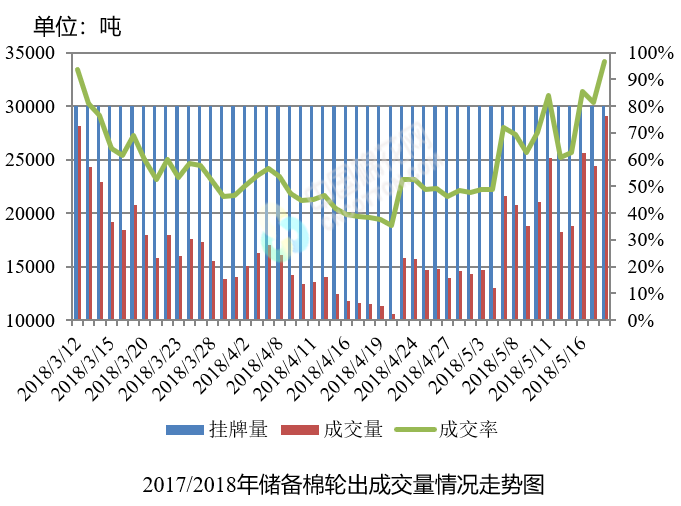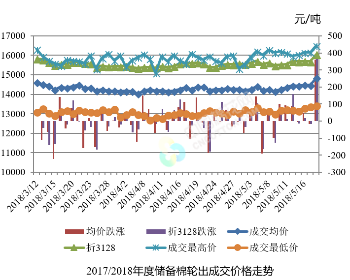 5月18日儲(chǔ)備棉輪出銷售資源30002.136噸,實(shí)際成交29051.083噸,成交率96.83%。平均成交價(jià)格14839元/噸(較前一日上漲362元/噸);折3128價(jià)格16058元/噸(較前一日上漲371元/噸)。