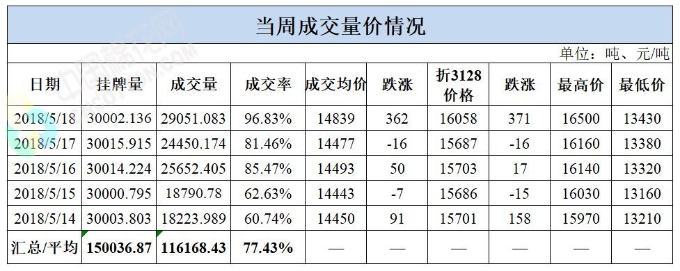 累計(jì)情況:截至5月18日,累計(jì)計(jì)劃出庫144萬噸,累計(jì)出庫成交82.3萬噸,成交率為57%;成交最高價(jià)16500元/噸,最低價(jià)12700元/噸。
