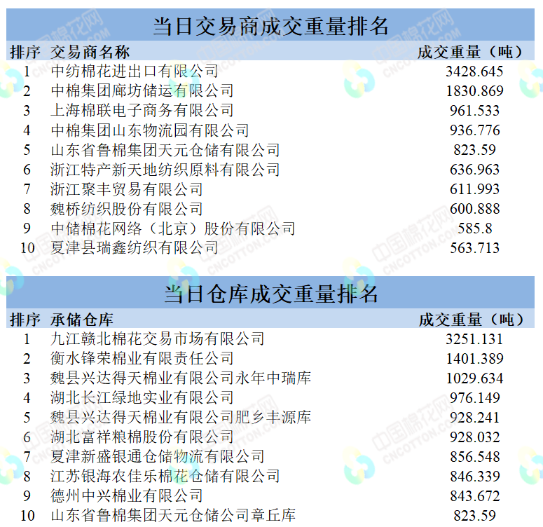 地產(chǎn)棉成交17071.349噸,成交率95%,成交均價(jià)14325元/噸,平均加價(jià)552元/噸,最高成交價(jià)16500元/噸,最低成交價(jià)13430元/噸;新疆棉成交11979.734噸,成交率100%,成交均價(jià)15571元/噸,平均加價(jià)1745元/噸,最高成交價(jià)16400元/噸,最低成交價(jià)14640元/噸。
