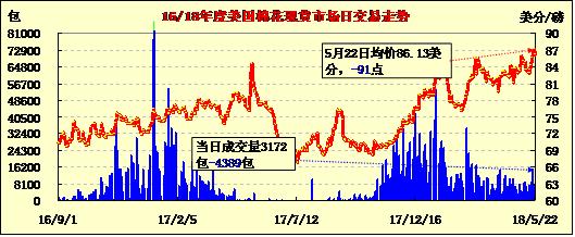 5月22日紐約期棉高位回落,結(jié)束五連陽,主力合約收于87.35美分/磅,跌107點(diǎn)。美國七地現(xiàn)貨市場交易與價格雙雙下滑,標(biāo)準(zhǔn)級成交均價86.13美分/磅,較前一交易日下跌91點(diǎn),比期棉主力合約低439點(diǎn)。其中主產(chǎn)棉區(qū)東得克薩斯洲78.25美分/磅,跌50點(diǎn),比期棉主力合約價低910點(diǎn)。截止5月22日,美七市場總成交197.22萬包,同比增加26.4%。